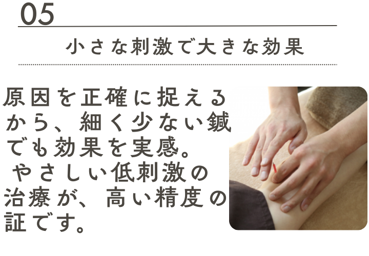 細い鍼、そして、少ない鍼の本数で成果を出せるのは、根本となる原因を正確に捉えているからです。低刺激の優しい治療は、精度の高い治療の裏返しでもあるのです。