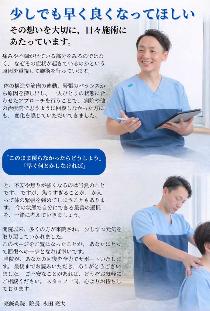 当院は、あなたの「本気で治したい」という想いに応える治療院です。