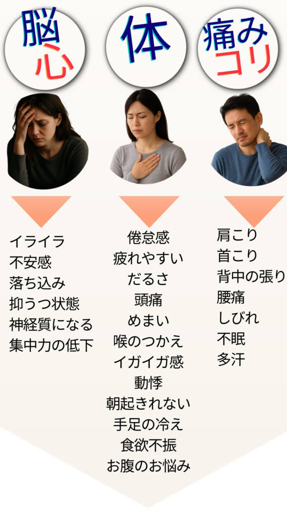 その結果、めまい・頭痛・しびれ・胃腸の乱れ・不眠・冷えなど、全身にさまざまな症状があらわれます。