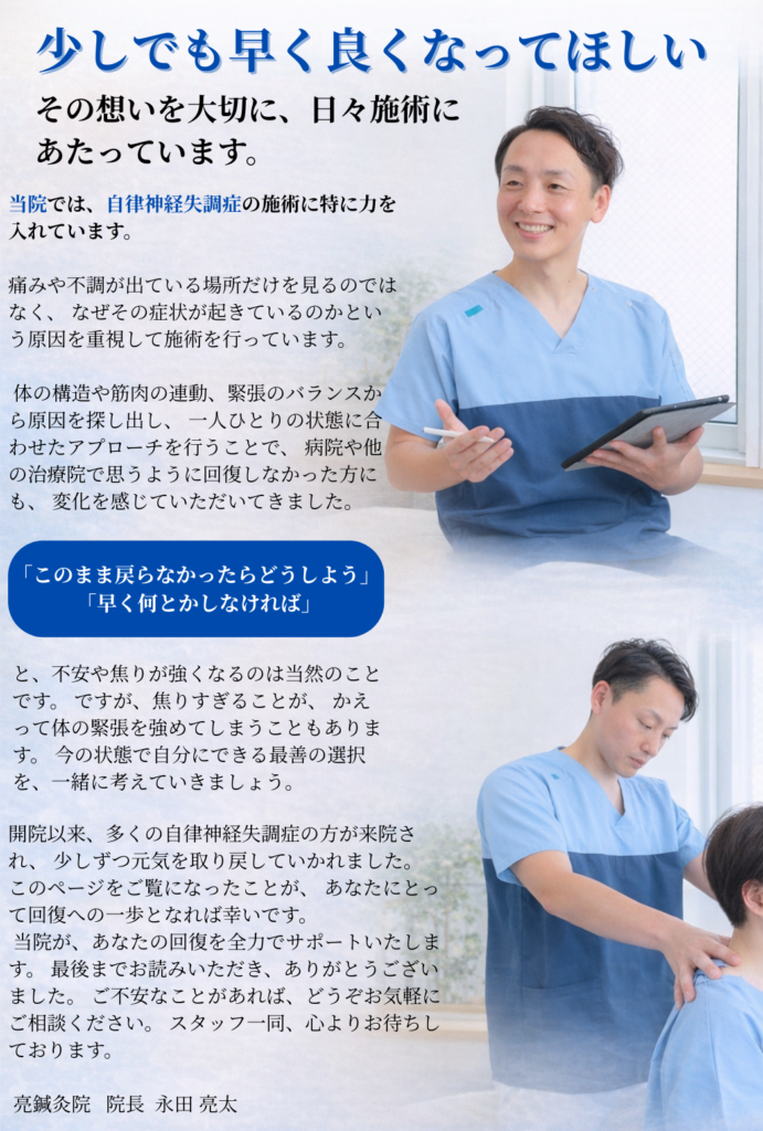 当院は特に 自律神経失調症の改善に力を入れている鍼灸院 です。